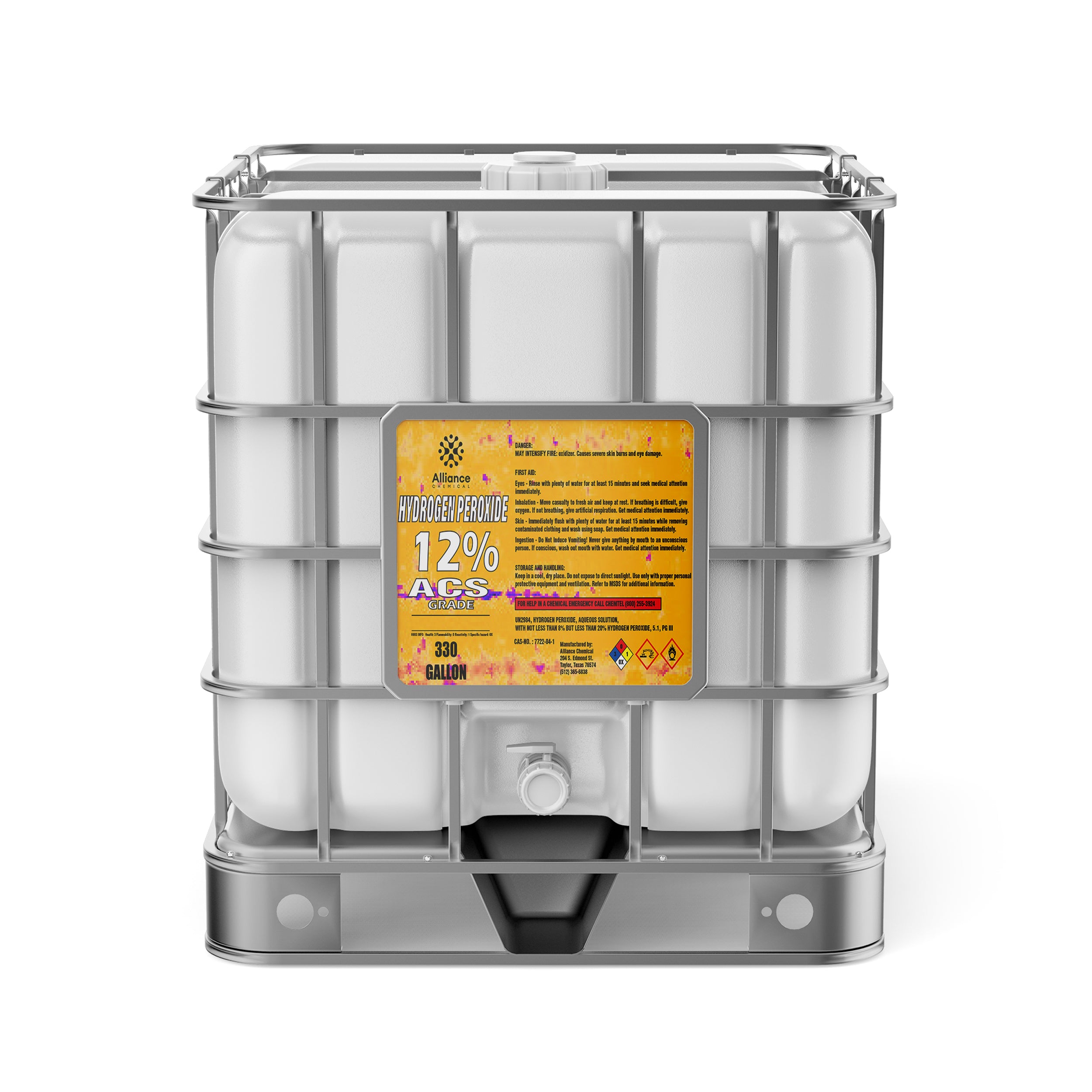 In case of spills or exposure, evacuate unprotected personnel, ventilate the area, and consult the SDS for emergency guidance. For skin or eye contact, rinse thoroughly with water for several minutes and remove contaminated clothing. If inhaled or ingested, seek immediate medical attention and follow first aid instructions in the SDS. Transport and labeling comply with UN 2014 Hydrogen Peroxide, Class 5.1, Packing Group II requirements.
