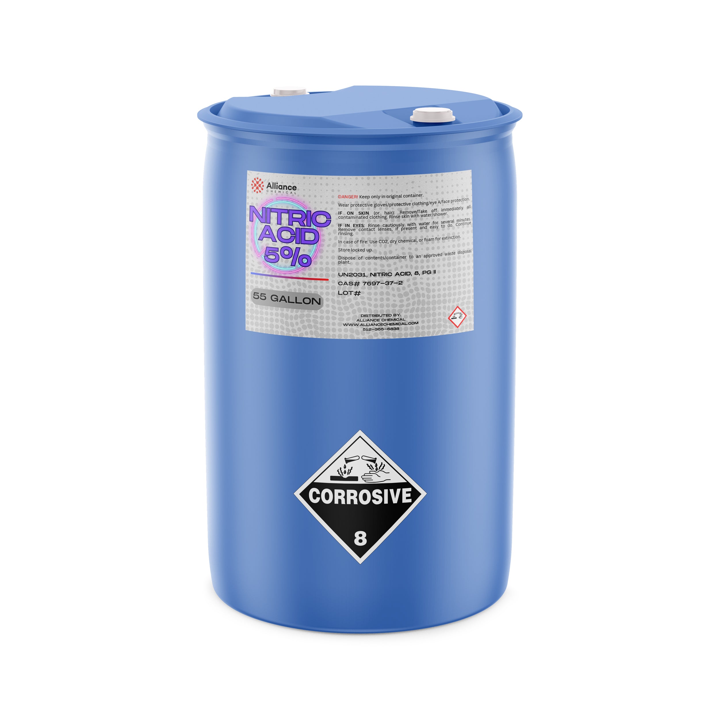 Nitric Acid 5% is a dilute aqueous solution of nitric acid (HNO₃), specifically formulated for safe handling while delivering controlled oxidizing strength. The solution presents as a clear, colorless liquid with a pungent, acrid odor and a density near 1.005 g/mL at 25°C, suitable for applications requiring reduced acidity relative to concentrated nitric acid. The product maintains a bright chemical profile with complete water miscibility, ensuring predictable dilution behavior and compatibility with standard laboratory glassware and reaction media. Typical assay values are centered around 5% w/w HNO₃, with a narrow specification window (4.8–5.2%), verified by titration with standardized NaOH per established methods. This grade is aligned with ACS Reagent Grade and USP-NF Monograph expectations, supporting reliable performance in analytical, preparative, and manufacturing contexts. The formulation emphasizes low trace metal content and stringent impurity controls to minimize contamination in sensitive processes, while the specific gravity range and controlled storage conditions contribute to batch-to-batch consistency.
